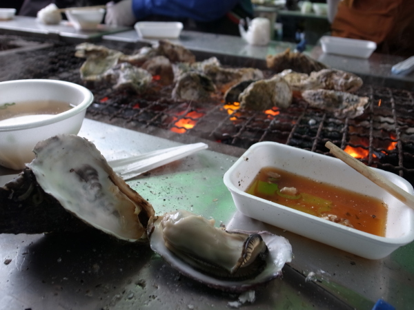 通されたところには既に炭火が赤々としていた。極寒の中走ってきたメンバーはその暖かさに満面の笑み。ところが10分も経たないうちに、完全重装備のメンバーには充分すぎる火力である事を思い知る。バイクで食べに来る時は防寒着はバイクに置いておく事をお勧めします。そして最初はよく判らないまま牡蠣を焼き始めると、更に想定外の出来事が。あちこちの牡蠣が小爆発を起こし、牡蠣の水分が飛んでくるのだ。店のHPには「牡蠣の水分などが飛んでくる事があります」と書かれているのは伊達では無い。戦場のように激しい中、しかし身の詰まったプリプリした牡蠣は最高だった!。