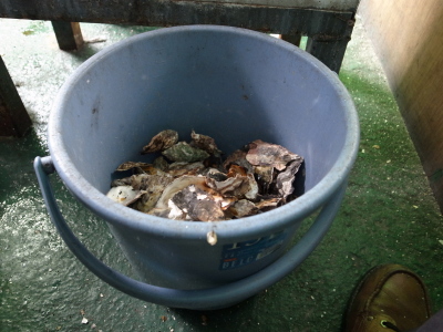 | ほぼ時間いっぱいで取り敢えず用意されていた牡蠣は完食、足元のバケツの殻になった。ごちそうさまでした! | |