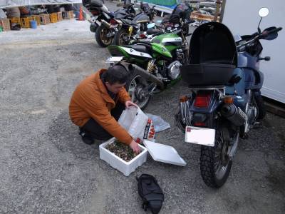 | あれだけ腹いっぱい食べたのに、更に2,600円分の牡蠣を調達した企画部長。それにしても大きな積載量を誇るアネーロ・バニアケース付とは言え、その箱では持って帰れないだろう。そう思っていたら何枚も用意してきたビニールに小分けし始めた。 |