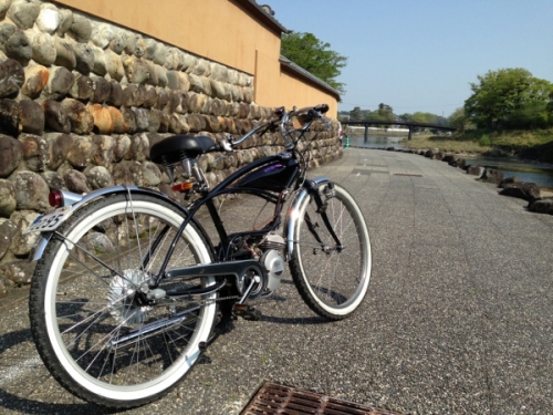 この日も、ツーリング途中のおしゃべり編がありました。五十鈴川の川縁でバイクを停めている男の人、私と同年代です。その人のバイクが、これまた珍しいんだ…。