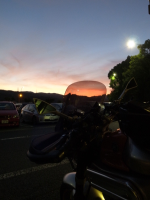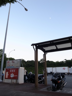 集合は4時半西宮名塩SA。夏の日帰りに限っては「行きたい場所」最優先。申し訳ないが集合時間・場所の配慮は二の次。到着すると、一番遠方のまさっちさんが到着済。さすがは現在RYUBEイチの脚の長さ(走行距離)。5時の朝焼けに浮かぶ(左の写真)のは、お見送りに来て頂いたRip氏のMT-01。