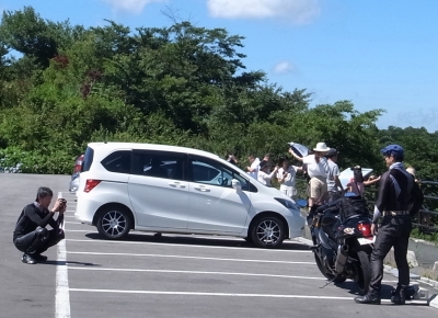 暫くしてパトカーが到着。普段は憎たらしい(失礼)警察官、この日ばかりはその姿が頼もしく感じた。続けて救急車・消防車が到着するもプロのレスキューでも崖下の様子が判らない為降りて行けない。隊員の呼びかけに先程の同行者から応答があった。無事転倒したライダーの傍に辿り着いたらしい。「意識はありますが、少し体が圧迫されて辛そうです」との返答。その回答を聞いたレスキュー隊員の判断は早かった。即座に無線で救助ヘリを要請。駐車場に着陸する為そこに居た観光客に車・バイクを移動させるよう指示があった。この時点で私達も出発。枡水高原の手前でふもとから上がってくるヘリとすれ違った。無事救助された事を願う。