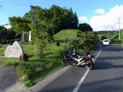 そして北側を眺めると雲・霞ひとつ無い快晴と大山!。この景色をずっと観たかったんだ。来て良かった〜!横を観るとまさっち氏が愛車隼を前後に動かしながら写真を撮っている。一段落した後はひめやん氏をカメラマンにして御自分も入ってポーズ。いつも通りの息の合ったコンビである。