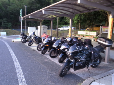 予定通り5時出発。お見送りのRipさん、1年間のお役目終わるのをお待ちしています! 中国自動車道〜鳥取道はヤンチャなメンバーは誰も居なくて、常識的なペースと気持ちの良い隊列で淡々と進む。「ポプラ八頭用瀬店」は予定通り7時前到着。ちなみにポプラ交差点近くのセルフ・ガソリンスタンドは、7時開店。用瀬から人形峠を経由する今回のコースは、ここを逃すと大山までガソリンスタンドが無い。実質このガソリンスタンドの開店時間が出発時間の上限という事になる(備忘録として)。