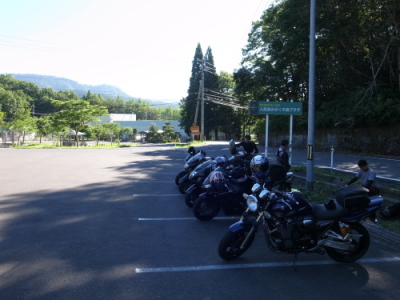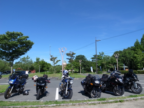 ひめやん氏@BMWのマフラーは中が真っ赤に焼けて「波動砲」状態だ(=まさっち氏談)。いったいどんなスピードでここまで来たのだろう?ルーキー氏@CBRは腰の痛みを押して参戦してくれた。はるさん@XJR、去年5月は仕事の関係で2時間遅れで本隊を追走、今回は無茶をしなくてすむ。超早朝にも係らず時間前に5台+お見送り1台が無事集合。