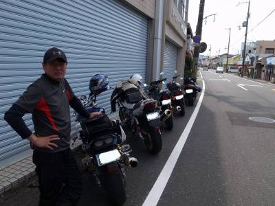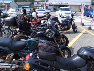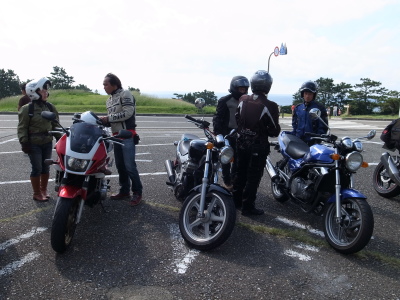 | ここでケロ愛機と同じER-5乗りのskgoさんが合流。ケロが整備を依頼している「ヤフオクバイク屋」で購入。ケロとは以前から連絡を取っていたようで、到着後すぐにマイナー車オーナー同士の超マニアックな談義となった。 |