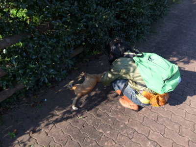 | 大きな有料駐車場に停めて、5分程歩く。道端に大胆な猫がゴロット昼寝している。それをなでる動物好きのKeiさん。 無愛想だが人懐っこいこの猫、なんとなくケロに似ている。そういえば過去のツーリングではケロ犬もいた。和歌山の海岸沿いで暮らしていると個性的な性格の犬猫が育つのか? |