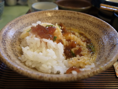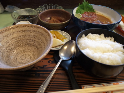 | ここの名物はさけ茶漬け。最初はタレにつけたかつおの刺身を御飯にのっけてそのまま頂く。 次に残りのかつおの刺身をどんぶりに載せて、おすましをかかけて食べる |