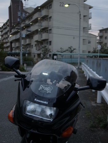 那智勝浦〜新宮の手前までバイパス道路が出来ていた。その後走った「道の駅おくとろ」廻りの169号でさえ、道が随分良くなっていた。これでだいぶ距離を稼げた。169号を北上し杉の湯川上まで走る間。こたやん氏とK氏は快調に前をパスしてゆく。私はヘタレなので無理はしない。結局満足に休憩をとれずに杉の湯川上まで走りきった。ここで皆さんと別れて、私は明日香村経由で岐路につく。自宅到着は18時。なんとかギリギリ日没前にたどり着く事ができた。ちなみに道の駅「おくとろ」以降はコメリ購入のLEDライトを点灯。ヘッドライトの役割は全く無理でも、対向車にアピールするだけのインパクトはあった(下の写真)。