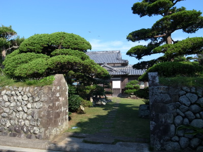 | 塩御崎燈台の宮司さんの家だろうか?低い石垣は台風の通り道になる沖縄諸島のものと似ている。 庭木・屋敷の立派な佇まい。思わずうっとりと眺めてしまった。 |