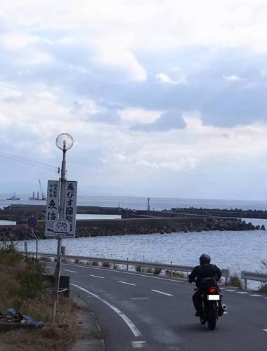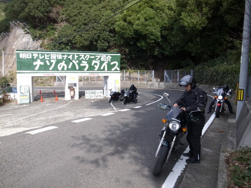 土生港で小休止した後は、淡路島のハイライト県道76号線。土生から暫くは瀬戸内海を真横に眺めながら、信号が無い道が続く。コンクリート造りの道は飛ばせるがバイクも跳ねるので要注意。海岸沿いから山間部に入って暫く走ると現れたのが「立川水仙郷、ナゾのパラダイス」入口。この日は閉まっていたが、RYUBEで初めてメンバーが増えた最初のツーリングでは立ち寄っている。とんでも無い急坂をヒヤヒヤしながら降りていったのが懐かしい。