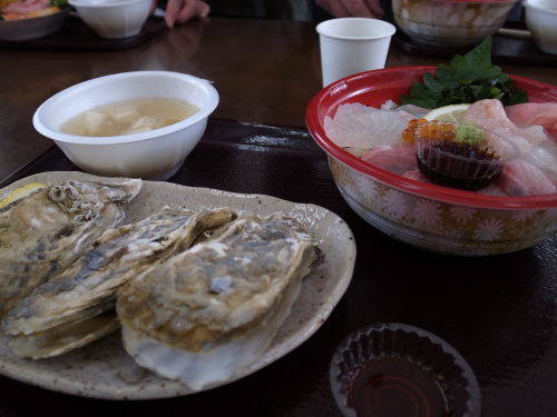 海鮮丼に牡蠣をつける。リーズナブルで美味しい。淡路島の道の駅は、南の端「うずしお」、北の端「あわじ」ともに時間を作っても立ち寄る価値がある。