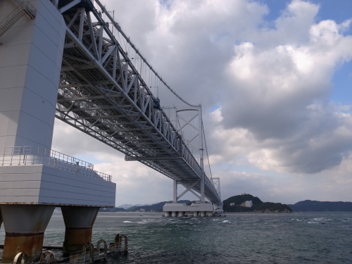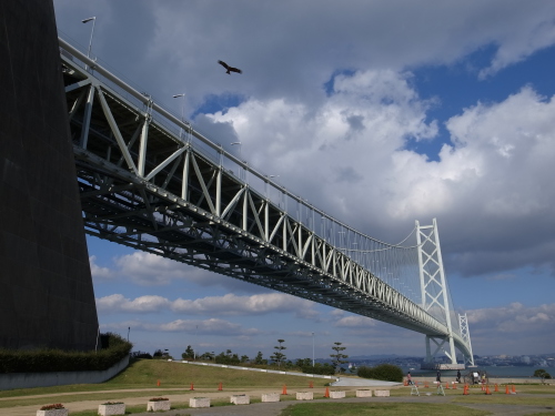 明石海峡大橋を真下から眺める。荒々しい鳴門大橋とは異なり、対岸の明石の町並みを背景に華やかな印象。