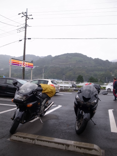 | 首都高〜東名〜大井松田ICで降りて、国道246号沿いに走り、もう一人の東京組ren氏とサークルKで合流。 お互いこの春から東京単身派遣の身。renさんには申し訳ないが、私はRYUBEの仲間が東京に居る事が心強い。 昼までに諏訪湖に入れば良いので、7月以来の再会に思わずコンビニのベンチで40分近く話し込む。ほとんど私がren氏に近況相談していたのだけれど。 |
