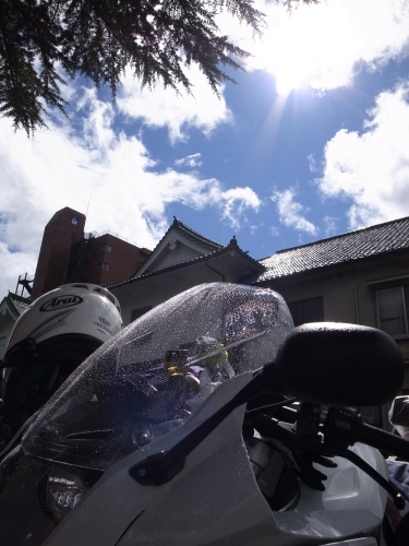 | ほぼ同時刻に大阪からルーキー・くるりん夫妻も到着し無事合流。そして、それを待っていたかのような青空! 1日雨覚悟で走っていて、思いがけず太陽が顔を覗かせただけで幸せな気持ちになれる。雨に濡れたバイクも絵になるというものだ。 |