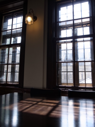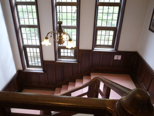 | 片倉館の内装の写真ばかりで申し訳ないけれど、この階段も素晴らしい。手摺、シャンデリア、窓、暫く眺めていたくなる程だ。 |