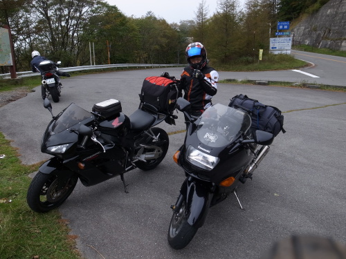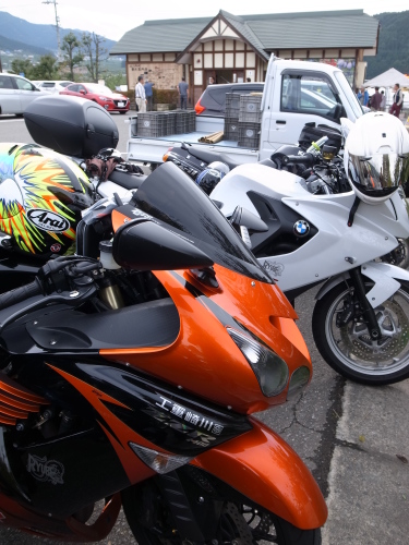 もうひとつサプライズ。美ヶ原の駐車場でバイクを降りたルーキーさんが叫んでいる。何と昨日別れたシャーミンさんのZZR1400がいるではないか!前日ヴィーナスラインには登りたい旨話はしていたがのだが、大阪からのフェリーの時間を考えると、このタイミングで再会できるとは思っていなかった。