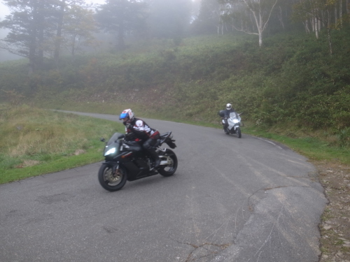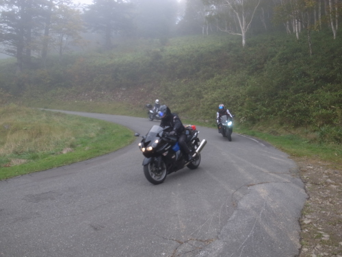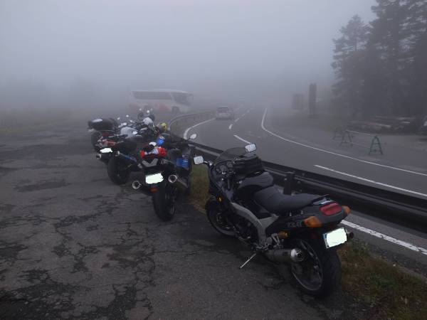 | 霧の中下ってくる一行。renさん@ZZR1400。 | |