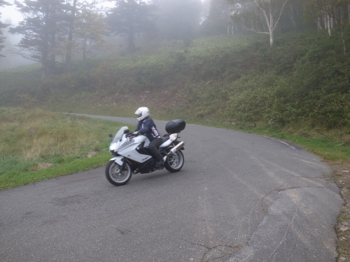 信州中野ICを降り国道292号に入った後、志賀高原を超え徐々に標高を上げていく。天候悪いもののさすがに3連休。交通量が多い。霧で視界が悪く抜き損ねているうちにバスを先頭とする大行列にはまってしまった。もっとも景色を観ながら登っていたのでそれ程苦痛では無かったが。