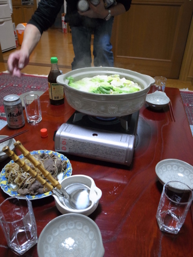 | 2日目は鍋を囲む。なんだか不思議な食べ物が出てきたり、1日目と変わらず大いに盛り上がった。 |