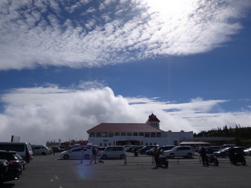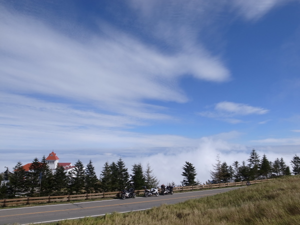 ヴィーナスラインは霧の中だった。そのまま霧ケ峰方面に行くか、美ヶ原まで行くか。結論はルーキーさんの「折角だから美ヶ原に寄っていきましょうか」とのお言葉に引かれた。霧の中霧ケ峰の手前最後に標高をあげていくと突然!突然綺麗にガスが消えて青空が顔を出した。雲は同じ目線か下に観える。雲の上に浮かぶ、まるでハウルの城に出てくるハウルとソフィーの秘密の高原のような景色。最後の最後でバイクの神様がとびっくりの御褒美を用意してくれていた。