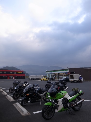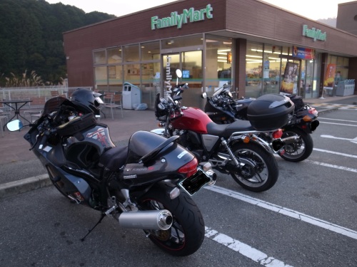自宅出発は5時。阪神高速の集中工事による通行止めを芦原〜福島で回避して集合場所のファミリーマート能勢町下田店到着は6時。フードコーナーで朝食を食べていると続々と参加者が到着。最初に到着はまっちんさん。つい先日まで大病を患って入院をされていたらしい。今回は車でお見送りに掛けつけてくれた。写真真ん中は企画部長ケロ@CB1100。こちらも公私ともに激動の時期を経て久しぶりの大型バイクでの参加。左は黒隼氏@隼は2017年の熊野灘ツーリング以来。最近近況をお聞きする機会が無く少し心配していたが変わらずお元気、黒い隼も健在で一安心。