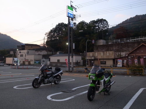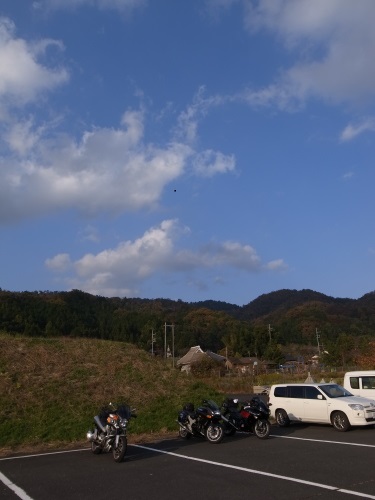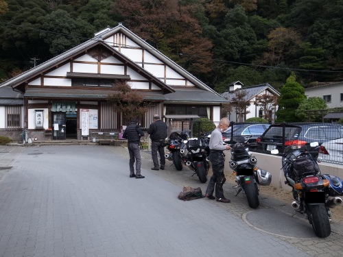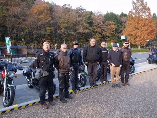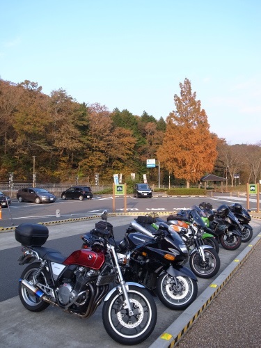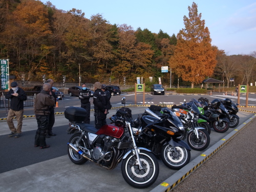 Rip氏@MT01とヤッシャー氏@GPZ900は2台揃っての到着。Ripさんはソロも覚悟していた今回の企画に真っ先に参加表明して頂いた。ヤッシャー氏は前日夜に単身赴任先の関東から新幹線移動し参加頂いた。GPZと御一緒できるのはいつ以来だろう。ここでの集合5台/6名揃ったところで予定通り7時出発。久しぶりに先頭を引っ張るケロ。気温6℃の中で結構なペースで飛ばしていく。国道173号は紅葉が色づいて綺麗だった。30分程度で次の目的地、道の駅「さらびき」到着。