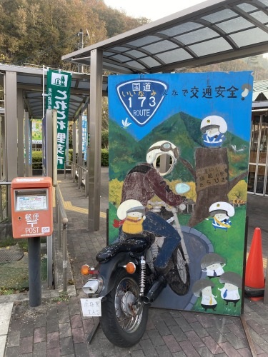 大きな店も無さそうな、駐車場に毛が生えたような道の駅ではあるが、休憩所/トイレに一番近い特等席にバイク/自転車スペースが広く確保されていて驚いた。おまけに不思議な看板。ここまで二輪に配慮してくれている道の駅は無いかも。寒さで凍えかけていたが、それだけでほっこり暖かくなるようだ。