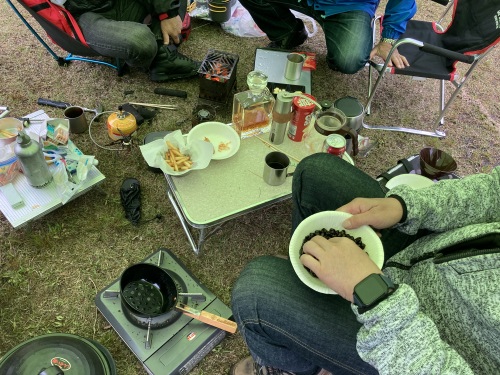 隣りの2号車タープはケロ、renさん、ぜいろく師匠。早速ケロが珈琲焙煎を始めている。