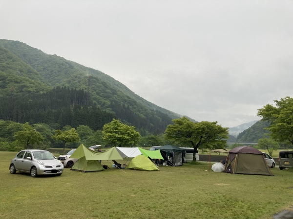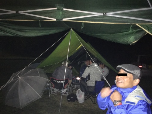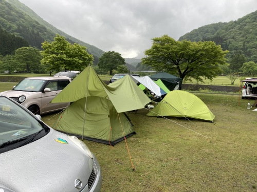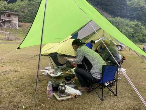 到着後間もなくパラパラと小雨が落ちてきた。大慌てでテントとタープを張る。本降りになる前になんとか設営完了。雨を見越してタープ4連結。