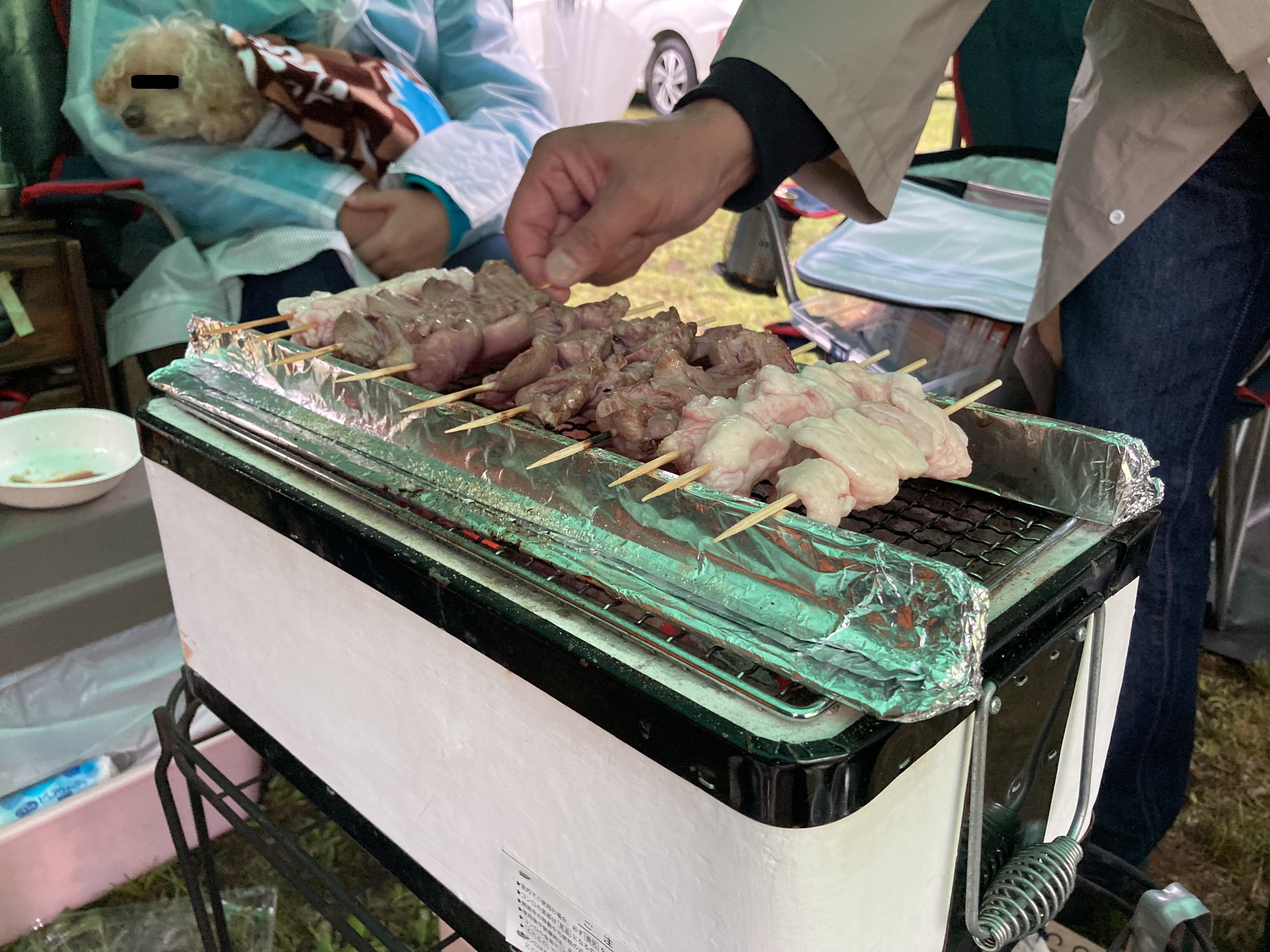 17時過ぎめいめいで宴会スタート!雨脚は強くなるものの連結タープの下からいい匂いがしてきた。私とkenはルーキーさん、くるりんさん、ソラ君、Ripさんの1号グリーン車タープにお邪魔させて貰う。長方形の七輪の上に焼鳥!ルーキーさんがせっせと焼いてくれたものを沢山御馳走になった。