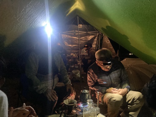 夜も更けてきて、雨脚に比例して宴会のテンションも上がる。宴会場は気が付けば1号車/2号車タープに集約。お互い入れ替わりながら飲み話す。20時過ぎ酒もだいぶまわってうる覚えではあるが、宴会での印象的なトピックスを一部御紹介。