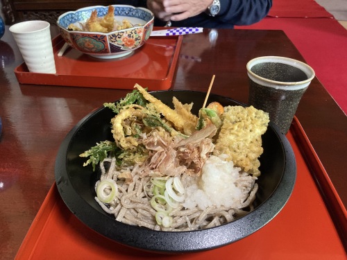 3年前の一乗谷ツーリングでも立ち寄ったお店。ゴツゴツした田舎ソバの風味は独特だけれど、ホクホクの山菜天ぷらとのコラボが美味。ゆっくり食べている途中にもグループLineには続々と参加者から大野市到着連絡が入る。天候不順を見越して今日は皆さんの行程が早い。