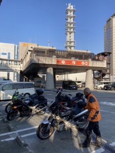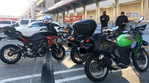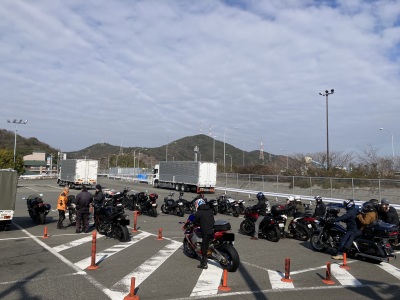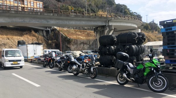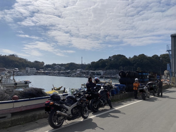 今回の私たちは4人ですミミオさん、ケロリンさん、はるさんと京橋PAで集合し、まず始めにやって来たのは室津漁港です。私たちは、バイクを停める場所について、もう一考する必要がありますね。