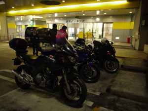 今回は最終9名が参戦表明。初めてお会いする方も3名おられます。6時ちょうどに自宅を出発し、20分ほどで阪神高速の湊町PAへ・・・。集合時刻の6時45分には、ケロリン@TDM900、ミミオ@ZX−11、はるさん@YZF−R1、スギ@ZX−9Rの4台が集結いたしました。スギさん、またバイク変わってまんがな・・・(苦笑)。 |