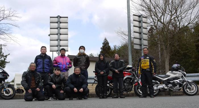 そうこうしている間に福知山市を抜け、綾部市へと入りました。舞鶴若狭道の綾部IC手前で一旦集合でございます。時刻はまだ10時30分少し前。ここからスギさんとヤッシャーさんは別行動。9人での走行は終わりでございます。恒例の記念撮影。