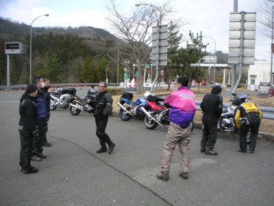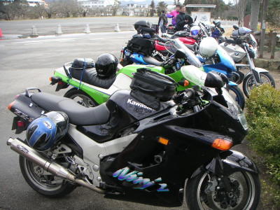 しばし歓談していると、メンバーが続々と集まってまいりました。Rip@SRX600、Ripさんのご友人のガンマさん@RGV−Γ、ヤッシャー@GPZ900R、HPを見て参戦表明されたゆうさん@speed triple、BMWさん@R1200R。以上9台+見送り車1台が集結いたしました。 |