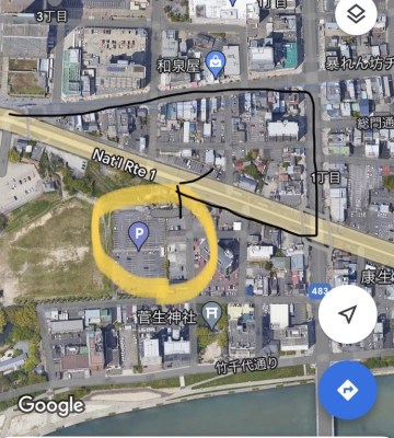 場所は下記写真。岡崎公園前→康生通→康生通南と回って左折で入る。