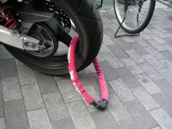 | 4.リンクケーブルロック このロックも比較的多く使われている物理的ロックです。 単なるワイヤーロックと違って、ワイヤーの周りにスチールリンク等を被せて破壊工作からの強度を向上させています。 U字ロックと比べて柔軟性があるので、長い商品であれば楽に固形物に繋ぐ事ができるので、使い勝手が良いロックと言えるでしょう。 また、比較的種類が豊富で安価な商品が出ているので、個々人の使用状況に合わせたベストの購入ができるメリットもあります(結構全長が長い商品もあり、距離のある固定物に繋ぐにも便利です)。 但し、見かけ以上に重量があるので、携帯するには結構不便なロックです。 |