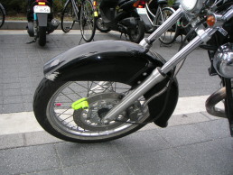 | 2. ディスクロック バイクのディスクブレーキの穴に、ピンを押し込んで装着し、ロックします。 手軽に持ち運びができ、なおかつ正しく装着すればバイクを確実に動けなくする事ができるので、U字ロックに次いで一般的です。 但し、このディスクロック単体ではバイクを固定物に繋ぐ事はできません。あくまでタイヤを固定させる事によって、バイクをその場から移動させる事を困難にさせる事が目的となります。 但し、右の写真のバイクのように前輪をロックしただけでは、仮に前輪をスケボー等に乗せてその場から移動させようとすれば簡単にできてしまいます。もしディスクロックしか持っていないのであれば、少なくとも後輪に掛けなければあまり意味がありません。 |
