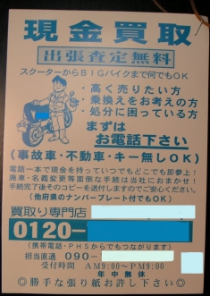 もちろん、まっとうな業者がほとんどでしょう。 しかし、同じ地区を何度もウロウロしている業者や、厳重に手入れ、保管しているバイクに 「買取チラシ」 をつけて回る者がいたら、注意した方がいいでしょう。
