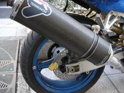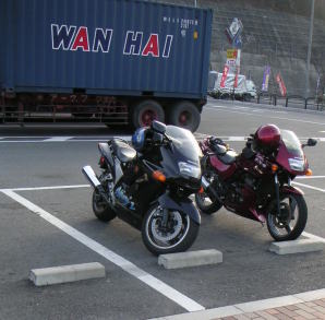 | @ あまり効果的でない駐車の状態 まずこの写真です。 物理的ロックが先程の青いバイクと同じ位置にセットされています。また、前輪は歩道との境の車止めまでは接していません。この状態では、私のZX−11は少なくとも、前にも後ろにもタイヤ1/4周分、動く余地があります。 まずは前後輪を台車で持ち上げる必要があります。 その為には前輪の前と後輪の後ろにスペースが必要になります。 残念ながら、この写真の状態では台車を前後にセットする事が可能です。 次に台車をタイヤに傾けて持ち上げようとするならば、タイヤがある程度転がらなくてはうまくゆきません。 しかしこれも残念ながら、前後に1/4周分タイヤは転がるので、手馴れた人ならば台車をテコの原理で使ってタイヤを持ち上げる事は不可能ではなさそうです。 私のZX−11、乾燥重量で何と233kgもあります。実際には前後輪台車で持ち上げて運んでいくのは至難の業、そうそうできる事ではないでしょう。 しかし、3〜4人のグループならば不可能ではないように思います。 ましてや、150kgそこそこの軽量な250ccクラスのバイクであれば、なおさらです。 |