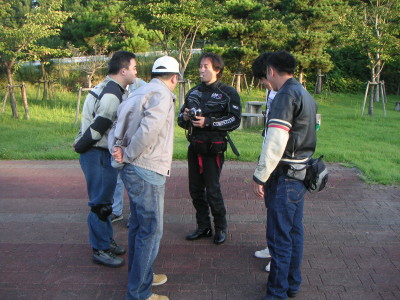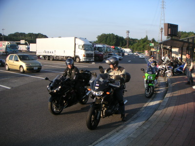 朝5時出発。松原ICから近畿自動車道に乗って、その後名神で草津PAを目指す。 名神・高槻の辺りで、追い越し車線と走行車線で何故か仲良く並行する車がいて、その後ろは長い車列。 いつもの如くTがぶち切れて強引に抜いていってしまった。 「無理はしない」がモットーの私はそのまま京都まで引きずられた。 草津PAには丁度1時間、6時に到着。先を行くTは「早朝高速ピットイン走行」の為京都東で一旦ICを降りた為、一息遅れて到着。