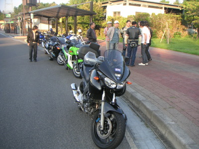 バイク用駐車場には既に5〜6台のバイクが停まっていた。 銀色のCBR1100XXは会社の先輩丸さん。暫くバイクを動かしていないとの事だったので声を掛けていた。朝が弱いとの事だったが無事起きれたようだ。 CB1000SFは冨吉さんだ。ren氏達”平湯キャンプツーリング”メンバーをお見送りした後名古屋まで昼食を食べに行くそうだ。暫くしてヤッシャー氏@GPZ900Rが、FIATに乗るご友人と一緒に登場。 それにしてもren氏の平湯ツーリングのお見送りに5人も集合するとは・・・ 物好きなメンバーが多いものだ。 まあ、実体は”お見送り”にかこつけて家を飛び出し、各々走りに行こうといったところだ。