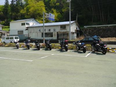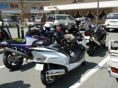 おっさん7人でおそろいの「ランチ」をば・・・(笑)。「エビふりゃ〜」が美味でございましたが、某横綱氏は量にご不満だったようでございます(爆)。まったりしていると時刻は12時半を回りました。長浜から肱川沿いに南下し、大洲市内へ・・・。R197にスイッチし、九州隊との合流ポイントである「道の駅・清流の里ひじかわ」へ・・・。13時15分頃到着。バイクはあれども人は居ず・・・?しばらく待っていると、昼食を終えた九州メンバーが続々と現れました。合同ツーリング、いよいよ開始でございます。