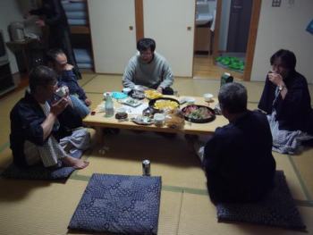 何とこの宿舎、建物の中に県境が通っております(驚)。ちなみに我々の寝床は愛媛県、宴会場は高知県でございました。 16時過ぎに天狗荘に全員集合。乾杯ビール(注:一部の方はコーラ)の後、子忍者氏のご親戚のSR氏は山を下って松山へ・・・。気をつけてね〜。さて、残り12人はチェックインの後「もらい風呂」に出かけます。天狗荘にも風呂はございますが、今朝方ボイラーが壊れたとのことでございます(汗)。 さあ、日が暮れました。宴会でございます♪ |