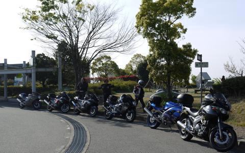 ここで九州メンバーのご紹介♪九州幹事の子忍者@ZX12R、姫@フォルツァ、ジンゾー@GPZ900R、クロ@GSX1400、シャーミン@ZRX1100、子忍者氏のご親戚@SR400(以上敬称略)の6台でございます。大阪と九州両方に「クロ」さんがいるわけでございますが、大阪は男性、九州は女性でございます。