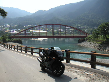 朝は、早起きの若年寄りTの悪戯で起こされた。夏とは言え、信州の山奥の大桑村は朝が結構冷える。それにしても寒いので気がつくと扇風機が私の方に向いていて最大風力で回っていた。それでも気にせずに、起床予定の7時ぎりぎりまで寝ていたが。 この日も快晴。前日の打ち合わせで、折角今日もほとんどの行程を高速走行するのだから、やはり気になるEX−4のチェーンの伸びはどこかバイク屋で調整してから高速道路に乗ろう、という事になった。取り敢えず中津川まで行って、そこでバイク屋を探す事にした。