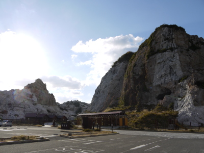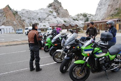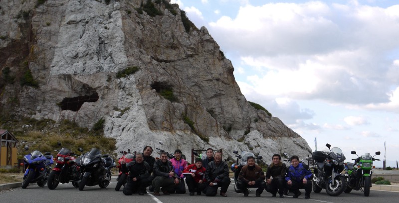 | 暫く海岸沿いを走行していると、いつの間にかTのTDMが先頭を走っていた。確信犯でどこか寄り道したに違いない(笑)。そのまま白崎海岸を目指すが、海岸沿いは強風が吹き荒れていて皆突風に煽られながらの走行。2時半過ぎに白崎海洋公園に到着。初めて訪れたがごつごつした白い岩山が不思議な光景を作っていた。とみきち親子は大丈夫かな? |