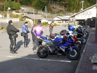 紀ノ川SAで集合した私ミミオ@ZX-11、T@TDM900、はる@YZF-R1、黒隼@隼、Rip@SRX600、そしてスギ@RVF400の6台で出発。颯爽と先頭で出発したが、あっという間にスギさんとはるさんにぶち抜かれた。スギさんのアクセルは何ccのバイクであろうとOn-Offしかないのだろう。結局400ccになっても変わらず先頭をかっとんで行った(もっともタダの400ccではないが)。私は初めて一緒に走るはるさんのYZF-R1の後を追う。阪和道も和歌山から海南まではそこそこ高速コーナーが続くがR1は非常に軽そうだった。海南を出たところでうえぽん氏と合流。今日の参加メンバー7名遅れる事なく無事集合。